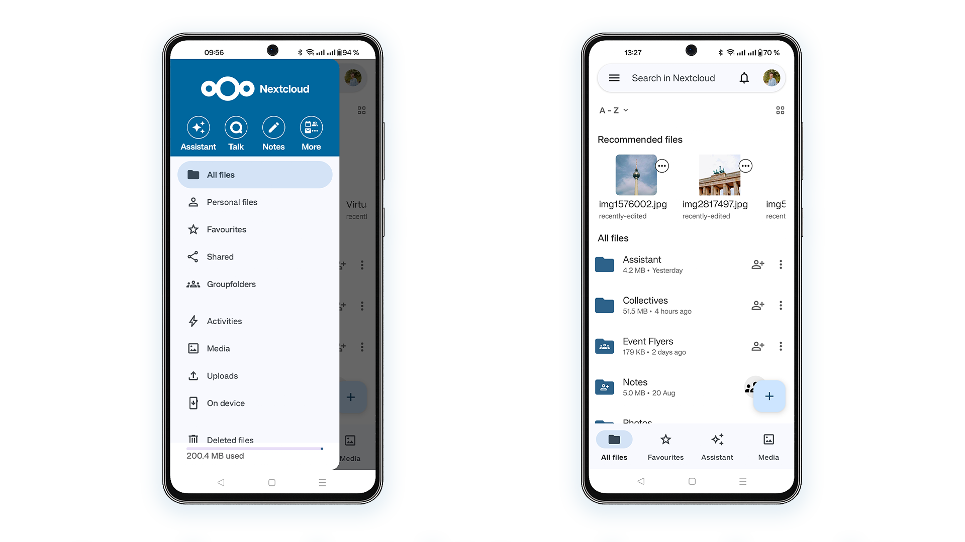 The Android app has some updates too. It inherited the new outline icons from Nextcloud Hub, and got an improved drawer menu for navigation.