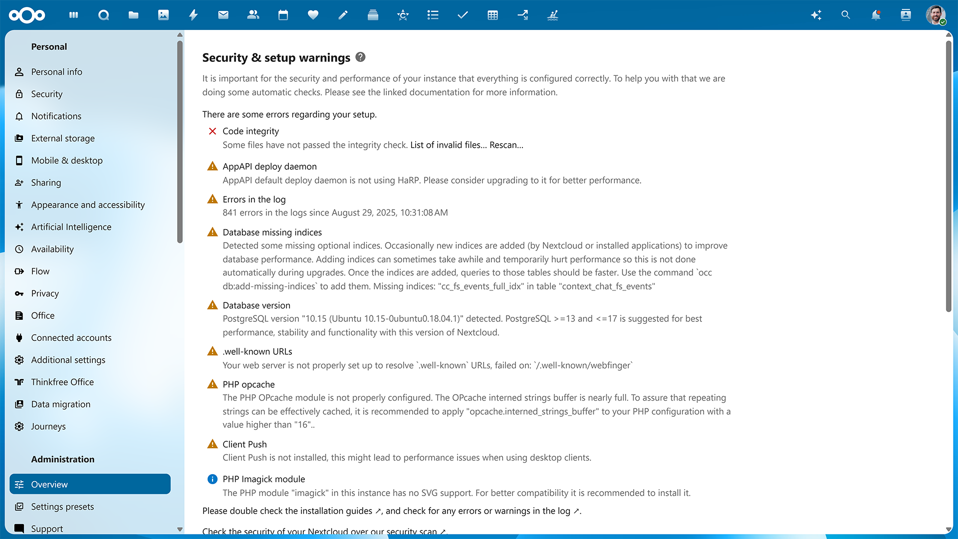 Setup checks guide you through configuration and installation options that need adjusting. We added checks on the push notifications setup in Talk, a check for Mail and a check for the Assistant. New Adaptive Setup Checks are available in Nextcloud Guard for enterprise users.